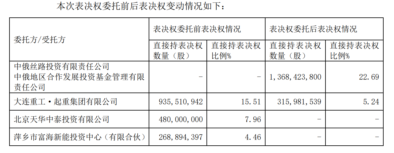 3月31日晚间,ST锐电披露,公司股东大连重工· 起重集团有限公司、北京天华中泰投资有限公司、萍乡市富海新能投资中心(有限合伙)将其所直接持有的公司股份共计13.68亿股表决权委托给中俄丝路投资有限责任公司(下称中俄丝路)和中俄地区合作发展投资基金管理有限责任公司(下称中俄发展),中俄丝路和中俄发展接受上述三家股东表决权委托后,可以实际支配的公司表决权股份合计13.68亿股,占公司总股本的22.69%。