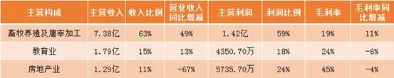 如2018年,房地产行业营收占比33.14%,其次是生猪,占比27.73%,教育占比13.8%,肉制品占比10.73%。