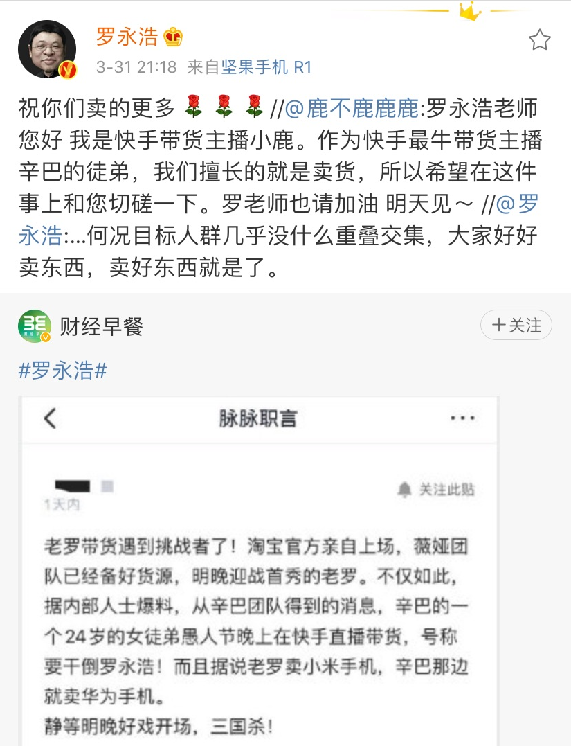 同样不甘心错过罗永浩开播热点的,还有活跃在快手平台的各大网红主播们,网传网红辛巴的一个24岁女徒弟也将于4月1日晚直播销售华为手机,“号称干倒罗永浩”。