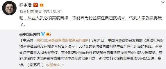 罗永浩本人也转发了这一报道,并表态道:“从业人员必须高度自律,不能因为粉丝信任自己就胡来,否则大家就没得玩了。”