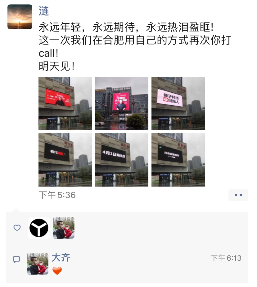 最后沟通到了合肥本地一家知名的广告传媒公司,负责人在听完锤友的诉求之后,了解到是由锤友群体自发众筹为罗永浩直播打广告,十分感动,最后决定免费提供大屏资源支持,帮助锤友们投放了外屏广告。