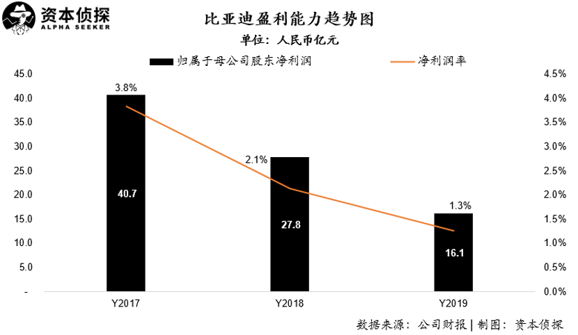 报告显示,比亚迪2019年全年取得营业收入1277.4亿元人民币,同比下降1.8%;归属于母公司股东净利润16.1亿元人民币,同比大幅下降42%,净利润率仅为1.3%,而这也是连续三年公司利润呈现持续下降趋势。