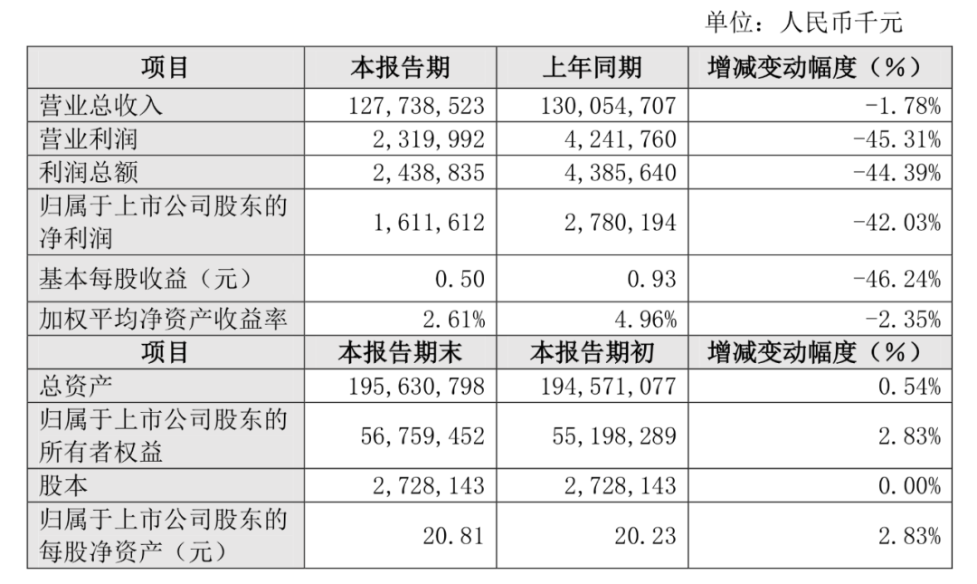 净利润大幅下降42.03%,营业总收入、营业利润、利润总额、归属于上市公司股东的净利润、基本每股收益、加权平均净资产收益率等主要财务指标也都是同比下滑。