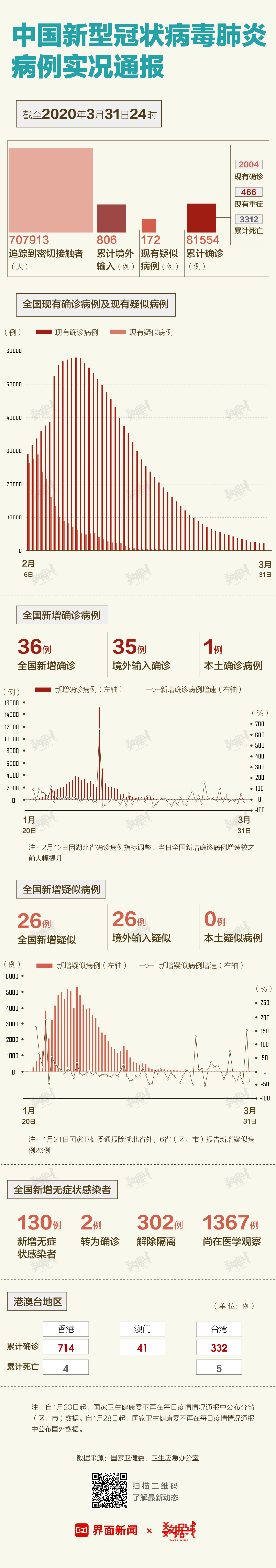 全国新增确诊和疑似病例双双下降。3月31日,全国新增确诊病例36例,其中境外输入病例35例,本土病例1例,来自广东;全国新增疑似病例26例,增幅从前一日的158.82%降至-40.91%,均为境外输入病例。