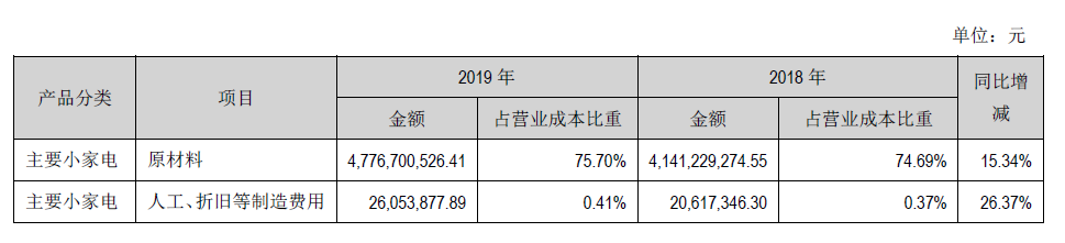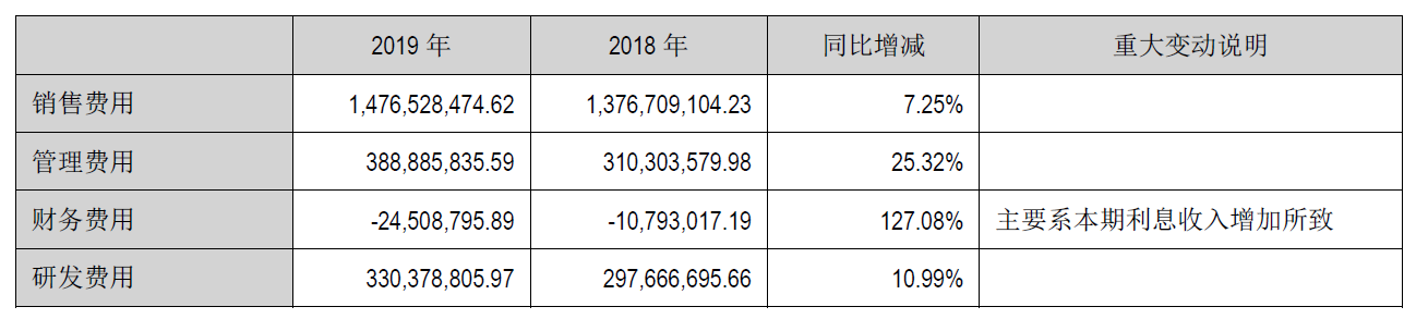 2019年其营业成本为63.10亿元,同比上升了13.82%,与营收增速相匹配。其中原材料带来的营收成本47.77亿元,占营业成本中的75.70%与2018年变动不大。