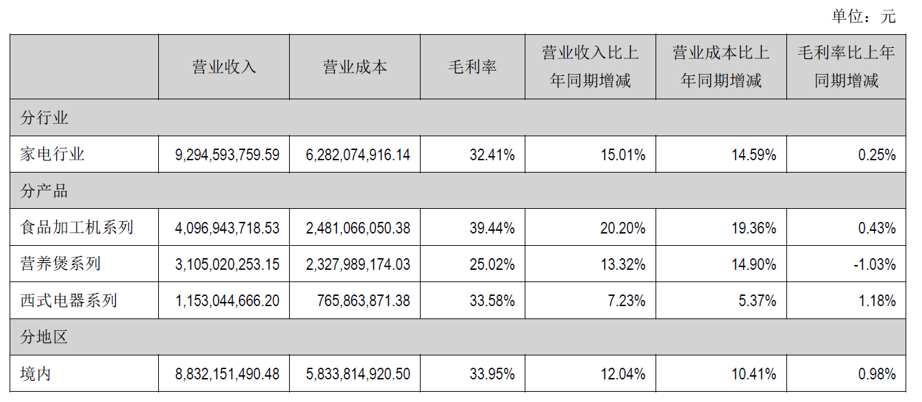 主营业务方面,家电行业贡献了九阳股份2019年营业收入的99.39%,毛利率为32.41%,同比增加0.25%。其中94.45%的收入来自于境内贡献。
