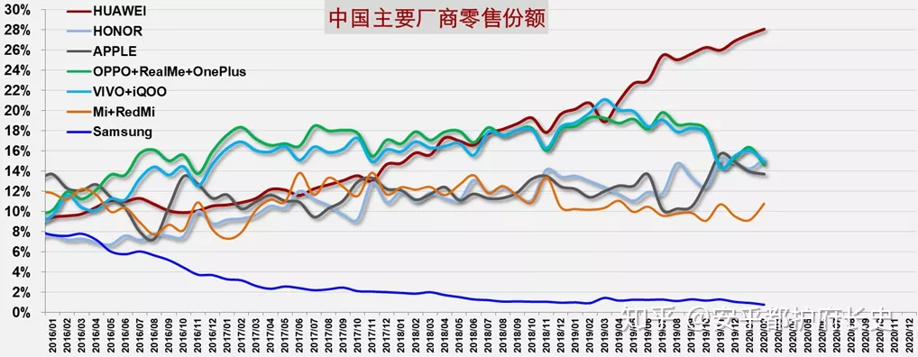 日前,从知乎手机大V“安乎都护府长史”处流出的一份“中国手机市场销量份额趋势”图显示,今年2月份,华为拿下 28.1%份额,位列第一,荣耀以15.3%的份额,首次进入前二,紧随其后的是vivo(14.8%)、OPPO(14.3%)、苹果(13.7%),小米以10.8%的份额跌至第六。