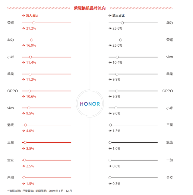 据巨量算数的统计,2019年全年,在衡量存量市场竞争力的手机厂商换机品牌流向(流出和流入)看,对于荣耀手机,除去自家的华为和国外品牌,vivo以10.4%、OPPO以9.3%均大于小米的9.0%流出比例,成为荣耀最大的流出品牌。结合流入品牌,荣耀相对于vivo流入自己品牌的9.5%,反而是负数,也就是说,在与vivo过去一年的存量用户竞争中,荣耀失大于得。