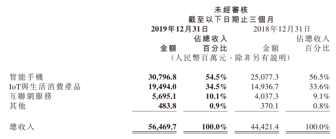小米2019年的营收依然主要来自手机、loT与生活消费产品,分别占比59.3%、30.2%。