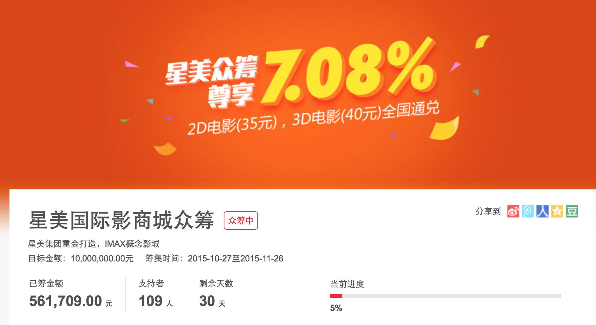 10月27日,“星美国际影商城众筹”项目在百度众筹上线。据了解,这次电影院总共所需的目标筹措金额为5亿元人民币,项目首期众筹金额为1千万,参与众筹的用户可使用众筹本金享受4折购票优惠,与明星见面等各种影院福利,到期未消费的金额按7.08%的年化收益享受补偿。此外,众筹金额两千元(含两千)以上的用户还可享有百度星美联名会员卡的所有VIP特权。