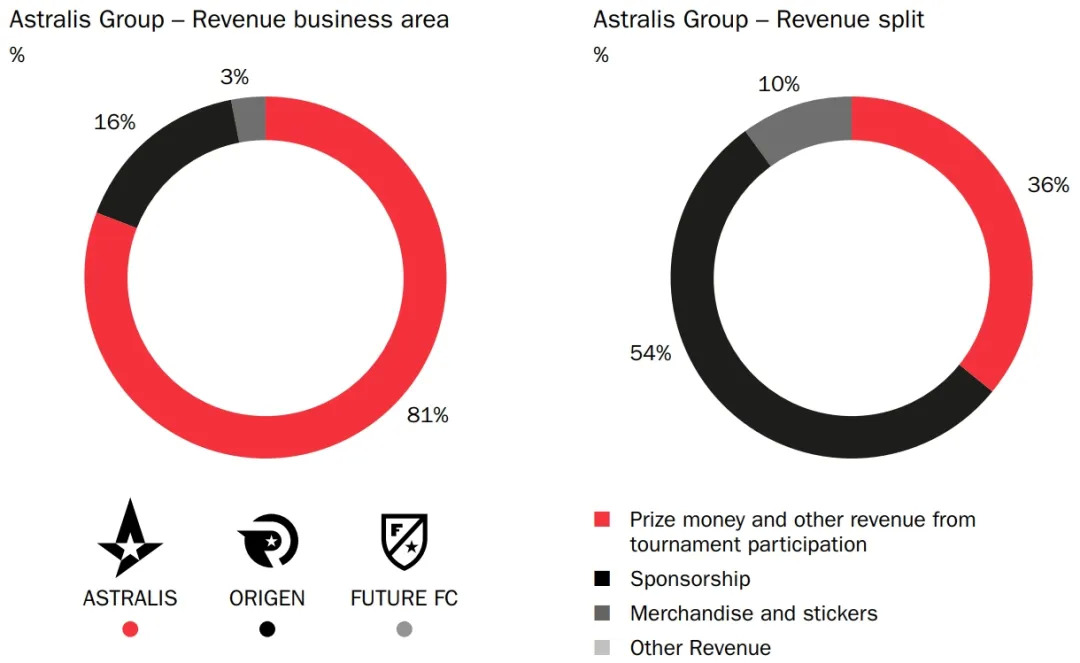 Astralis Group旗下拥有《CS:GO》战队Astralis、《英雄联盟》战队ORIGEN以及《FIFA》战队Future FC。他们的核心商品——三支战队,对2019年营收的贡献分别占总体的81%、16%以及3%。