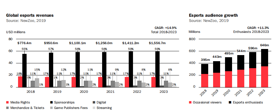 同时,据Newzoo去年的研究显示。未来数年,赞助收入仍将继续作为电子竞技市场的主要收入来源,且在2023年之前基本稳定在59%左右,Astralis Group现在为54%。此外,电子竞技的核心观众比例也会下降,取而代之的是更多普通电竞受众的出现。