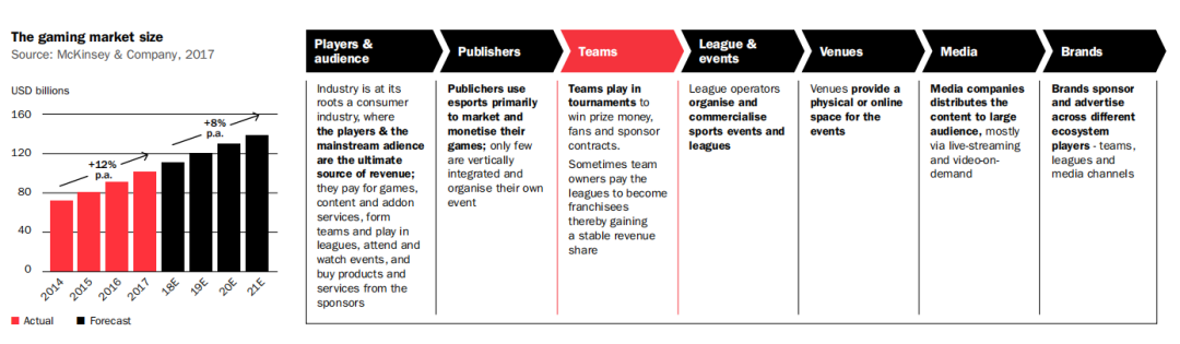 Astralis Group引用了一份2017年的电竞市场体量预测来说明电竞市场的扩张,数据显示游戏市场在2017年前实现每年12%的平均增长,随着体量整体扩大,电竞市场的增长率会下降,但总体仍能维持8%的高平均增速。