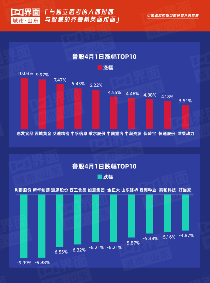 受大盘影响,4月1日,山东省内沪深股票有68只个股上涨,134只下跌,9只与上一个交易日收盘价持平;惠发食品、园城黄金涨停。