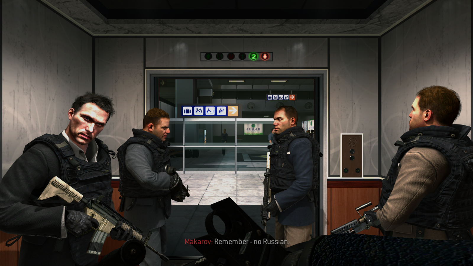 这个“具有极大冲击力的关卡”就是游戏中的“不准说俄语(No Russian)”一关。玩家扮演的卧底特工参与了一场针对莫斯科机场的恐怖袭击,跟随恐怖份子在莫斯科机场屠杀平民的设计,在当时引起一片哗然。