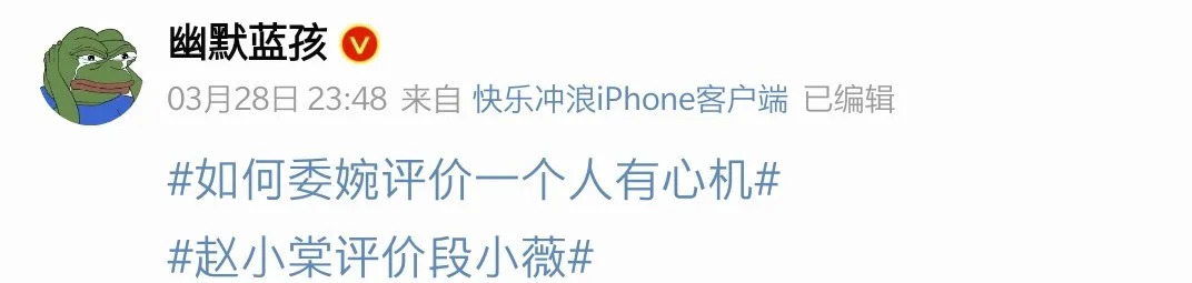 有了这些铺垫,哪怕赵小棠在节目中夸赞了段小薇,也被片面截图,带上#如何委婉评价一个人有心机#的话题冲上热搜。