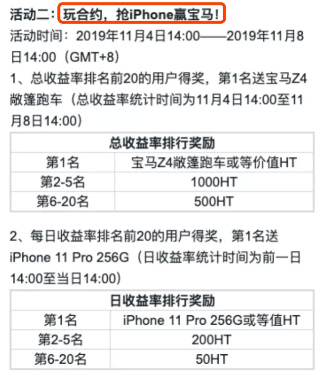 比如,火币、OKEx、币安三大交易所都曾发起合约大赛活动,拿出豪车、iPhone等奖品奖励玩家。