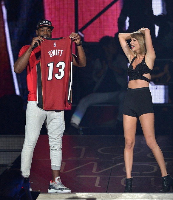 随后,迈阿密热队的当家球星韦德(Dwyane Wade)也来到了现场,韦德为这位“流行小天后”送来了一份惊喜-一件专门为霉霉而做,绘有她幸运数字“13”的热队球衣。