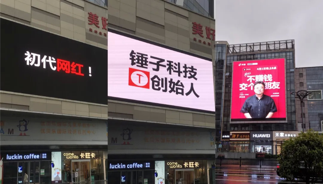 3月31日下午,几名罗永浩的粉丝自发组织起来,承包了三块位于合肥繁华地带的LED大屏幕,给老罗第二天的抖音直播首秀预热。