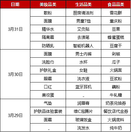 即使淘宝一姐薇娅,在选品方面把握得也相当保守。我统计了她3月29日到 3月31日连续三天的直播商品种类,共43样商品,可以看出生活日用品和小零食品类占据了货品的67%以上,而美妆品类里也不乏像洗脸巾、美妆蛋这样的低客单价单品。