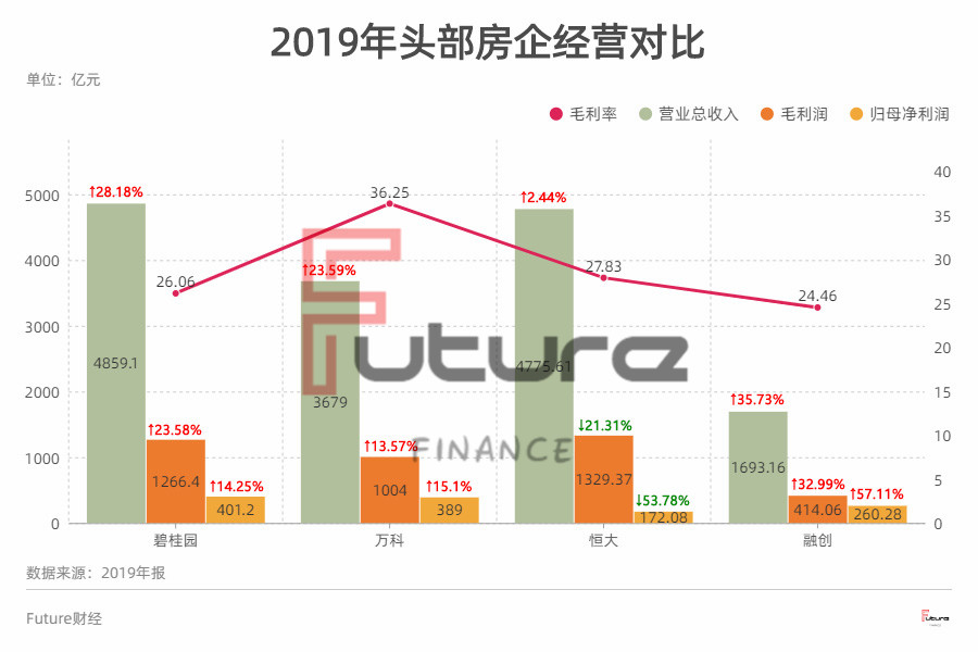 2019年融创实现营业收入1693.2亿元,同比增长35.7%;毛利达414.1亿元,同比增长约33%;归母净利润创历史新高达260.3亿元,同比增长57.1%;净资产收益率约为37.2%,同比增长4.3%。