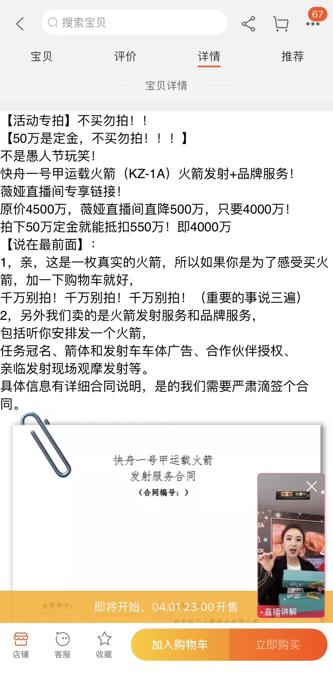 4月1日晚,薇娅的直播间里迎来了她有史以来带过的最贵的货:一艘火箭。就在薇娅喊完“上链接”后的一秒,商品页立刻显示“售空”。