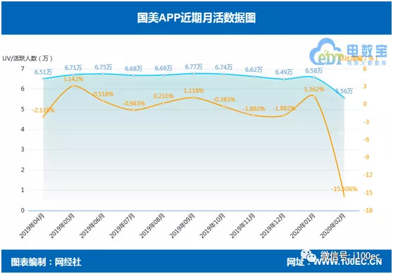 另据网经社“电数宝”(DATA.100EC.CN)监测数据显示,国美APP近期月活表现直线下滑。在2019年3月-2020年2月期间,有6个月出现不同程度下滑。其中,2020年3月创下近期最大跌幅,月活为5.65万,环比下滑15.506%。同时,在月活增长的月份中,其增长幅度并不明显。