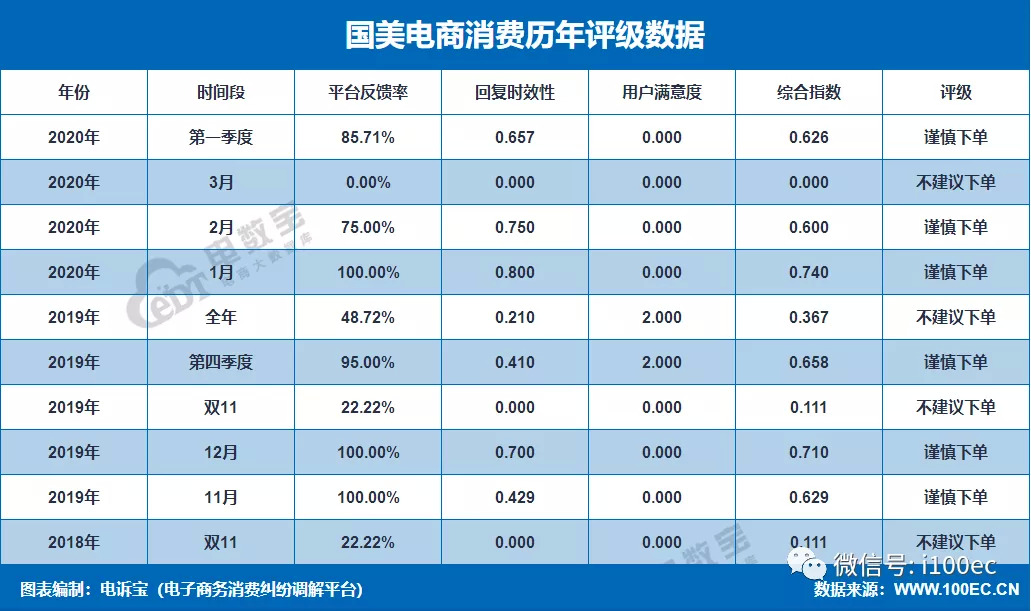 此外,据“电数宝”显示,“国美电商”共获得10次消费评级,获“不建议下单”、“谨慎下单”评级,需积极受理第三方移交督办的全国各地用户投诉线索并第一时间相应、及时反馈,奋起直追,努力提高售后服务水平和口碑。