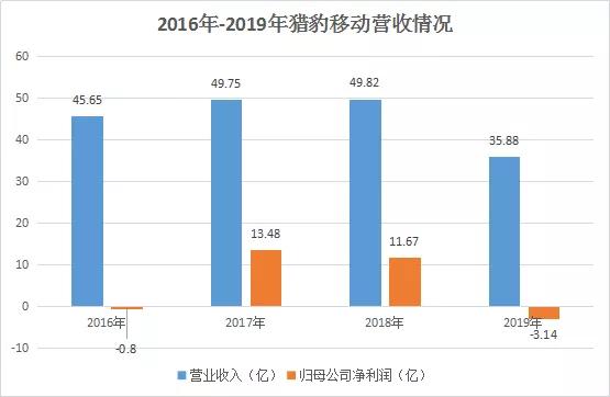 据财报显示,2016年、2017年、2018年及2019年,猎豹移动的营业收入分别为45.65亿、49.75亿、49.82亿及35.88亿;同期归属母公司的净利润分别为-0.8亿、13.48亿、11.67亿及-3.14亿。