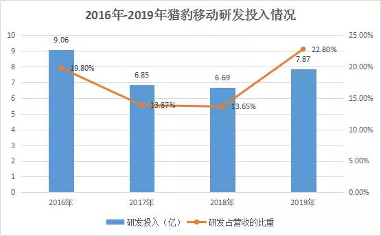 从研发投入方面来看,据财报显示,猎豹移动2016年、2017年、2018年及2019年的研发投入分别为9.06亿、6.85亿、6.69亿及7.87亿,分别占当期营收的19.8%、13.87%、13.65%及22.8%。与2016年至2018年相比,猎豹移动在2019年确实加大了研发投入,印证了“ALL in AI”的决心。