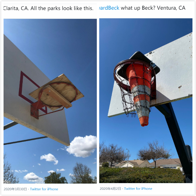 在网上,一名名为Howard Beck的篮球记者发起了相关话题,人们纷纷拍摄下附近被上锁的篮球架,上传至自己的主页参与互动。其中,也有人表达了对政府这一行为的不满,认为这仅针对了篮球运动。