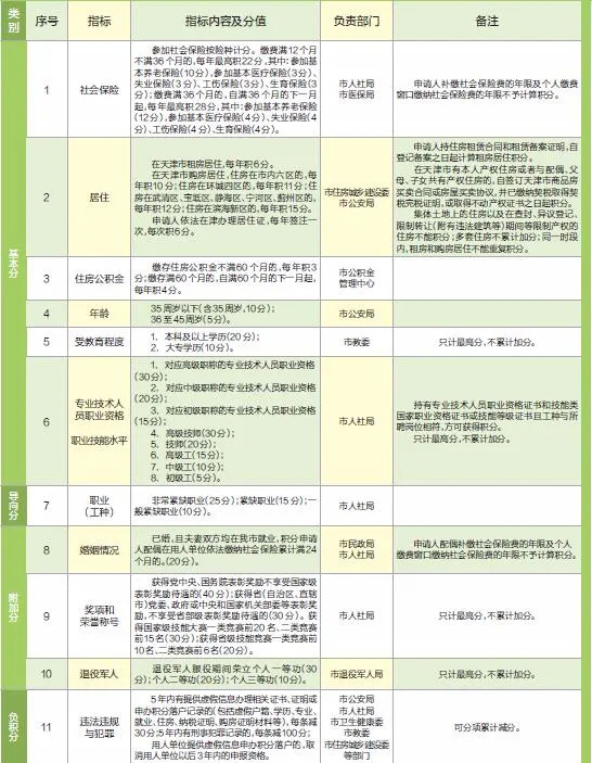 (三)聚焦热点,调整“积分计算”。坚持“房子是用来住的,不是用来炒的”。新设立了“居住”指标,增加了“租房居住”指标内容,在我市租房居住每年可积6分;将 “购房居住”指标内容一次性积分调整为按购房年限和区域积分。住房在市内六区的,每年积10分;住房在环城四区的,每年积11分;住房在武清区、宝坻区、静海区、宁河区、蓟州区的,每年积12分;住房在滨海新区的,每年积15分。租房居住可以按年确定积分,为短期内经济上暂不宽裕的“年轻人”带来了获得感和幸福感。