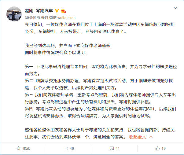 赵刚旋即在微博承认临牌获取方式不合法,并道歉。