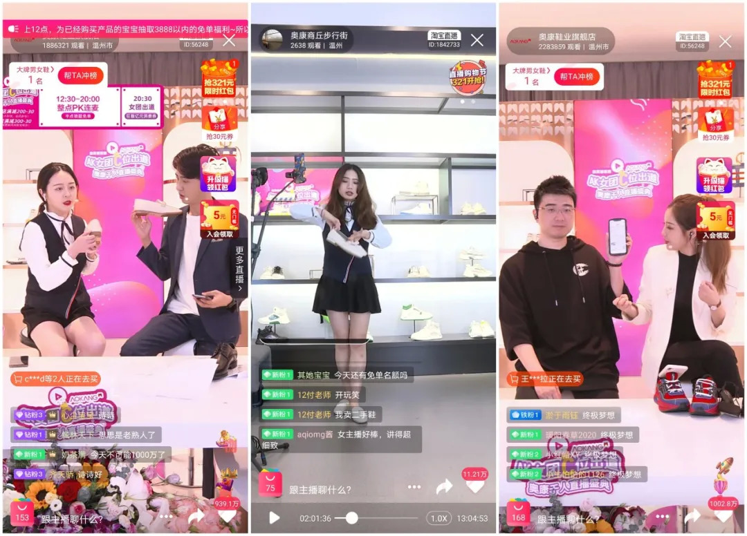 3月24日,天猫联合奥康共同发起“新风尚·千人直播挑战赛”,来自全国各地奥康门店的1371位奥康导购员化身“带货直播”,对着手机向广大粉丝朋友推销新款鞋,用户关注直播间可以领取优惠券以及满减折扣并随时下单。而奥康在全国各大片区的门店导购均进行直播带货PK“角逐”,当天上午就累计开播3000个小时,总观看人次达228万,互动点赞超1000万,“奥康女团C位出道”便创下了淘宝直播单品牌之最。