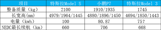 尽管小鹏P7定价与特斯拉Model 3有所重合,但其开发的对标对象为更大一号的Model S,这从三者尺寸也能大概看出来。而NEDC续航660公里的Model S整备质量为2100kg,比P7超长续航版重165/190kg。