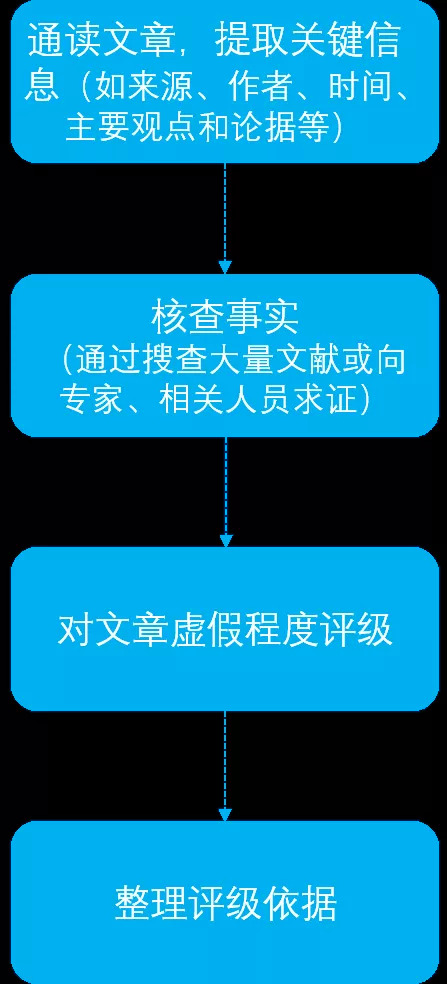 综上所述,我们可以看到事实核查人员核查新闻的大致流程是:通读文章,提取关键信息(如来源、作者、时间、主要观点和论据等)→核查事实(通过搜查大量文献或向专家、相关人员求证)→对文章评级→整理评级依据。
