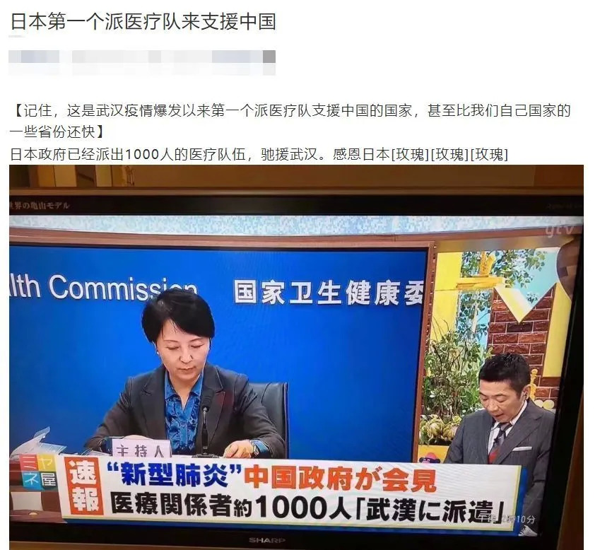 1月27日,一张日本读卖电视台报道中国新冠病毒的电视截图在网络疯传,同时还被加了注解,称“日本派遣1000人医疗队前往武汉”。然而真实情况是,由于日语表达习惯性省略主语,电视台报道的其实是“中国7省市”共派遣约1000名医疗人员赴武汉疫区。