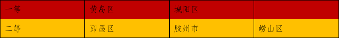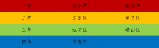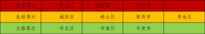 根据考核结果,青岛各区市中,黄岛区、即墨区、胶州市居经济社会发展综合考核优秀等次,黄岛区得分最高,在双招双引及改革创新两项单项考核中,黄岛区也以最高分位列一等次;平度市则在经济社会发展综合考核、双招双引单项考核及乡村振兴考核中居末位。