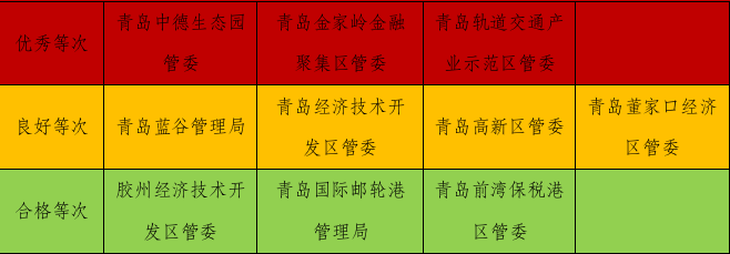 根据此次考核结果,四大试点功能区中,仅有青岛金家岭金融聚集区管委、青岛轨道交通产业示范区管委居功能区管理机构综合考核优秀等次,另有青岛中德生态园管委居优秀等次,且得分最高。