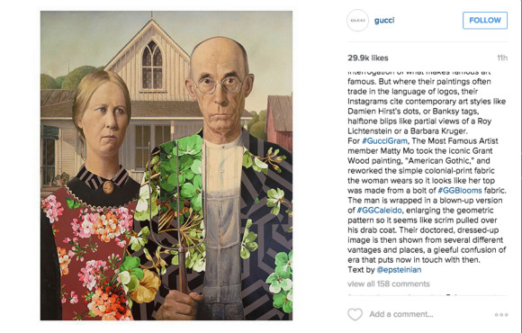 最近,只要在Instagram上输入#GucciGram的标签,你就会在Gucci的官方账号上看到一大波熟悉的艺术作品袭来。只是这些家喻户晓的作品又焕发了新生,它们都经过了Gucci和艺术家们的二次创作。