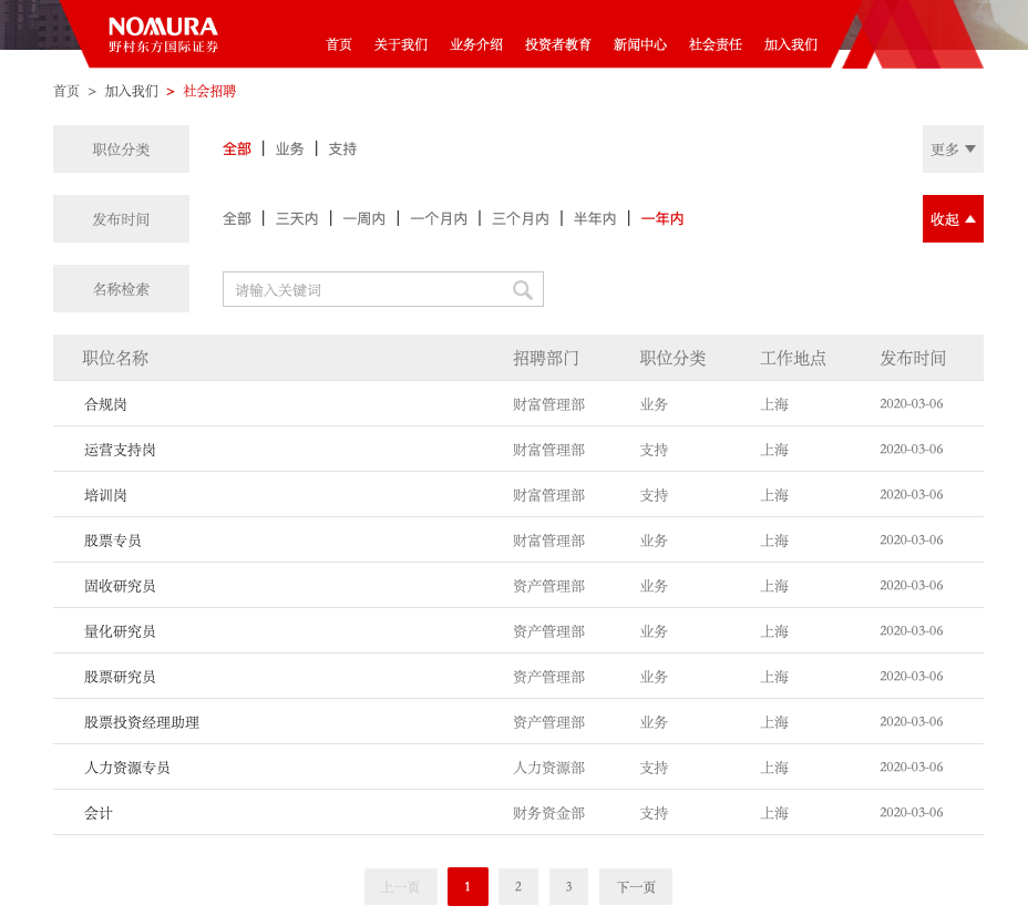 3月6日,野村东方国际证券官网更新了招聘信息。从此次发布的招聘部门来看,主要涵盖了财富管理部、资产管理部、人力资源部、财务资金部、企划战略部、法律部、产品开发部、研究部和运营部,招聘岗位则涉及研究院、分析师、财富顾问等。