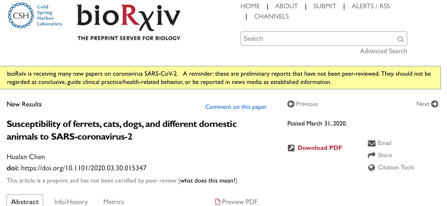 3月31日,中国农业科学院哈尔滨兽医研究所兽医生物技术国家重点实验室、国家动物疫病防控高级别生物安全实验室的研究团队在预印本平台bioRxiv上发表了名为Susceptibility of ferrets, cats, dogs, and different domestic animals to SARS-coronavirus-2的论文。