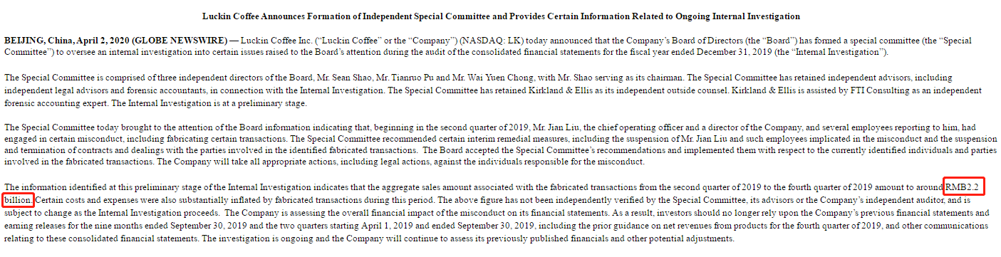 根据公告,4月2日,瑞幸咖啡宣布董事会成立特别委员会,负审查截至2019年12月31日财年的合并财务报表审计期间,提请董事会注意的某些问题的内部调查。特别委员会由董事会的三名独立董事组成,已就内部调查设立独立顾问,包括独立法律顾问和会计师。