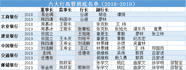 3月末,中国工商银行、中国建设银行、中国银行、中国农业银行、交通银行、中国邮政储蓄银行等六大国有银行年报披露完毕。对比2018年信息来看,2019年,六大行包括董事长行长在内的多个高管岗位出现重要变动,原因包括辞任、调离等,不一而足。