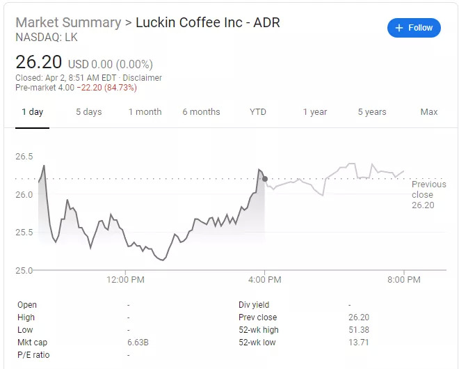 4月2日周四,瑞幸咖啡美股盘前跌超80%,从昨日收盘价26.2美元一路断崖式下挫至4美元。