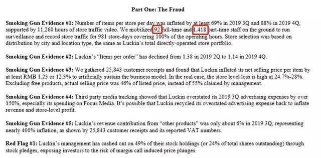 报告作者收集了大量内部微信聊天记录,认为瑞幸的平均每店货物数据在2019年第三季度虚增69%,在2019年第四季度虚增88%。同时还指出,瑞幸将2019年第三季度的广告支出夸大了150%以上,尤其是在分众传媒上的支出。