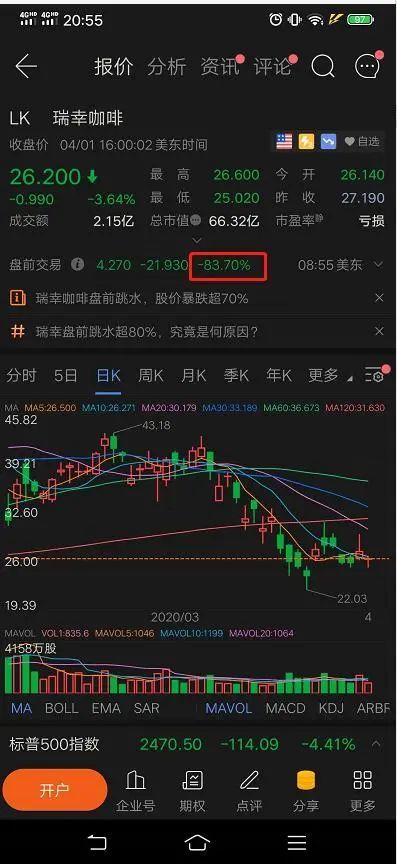 据21世纪经济报道消息,4月2日盘前,瑞幸咖啡盘前股价跌幅扩大至逾80%。公司调查显示,COO及其部分下属员工从2019年二季度起从事某些不当行为,与伪造交易相关的销售额约为22亿元。