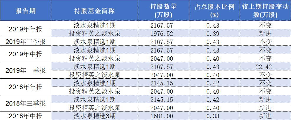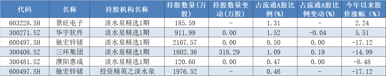 2018年中报时,“淡水泉精选3期”新进成为驰宏锌锗第十大流通股股东,持股比例为0.33%;同年三季报公布的前十大流通股股东中,“淡水泉精选3期”退出,同时“淡水泉精选1期”和“投资精英之淡水泉”最新进驻,合计持股数量为4192.15万股,合计占该股总股本的比例为0.82%。
