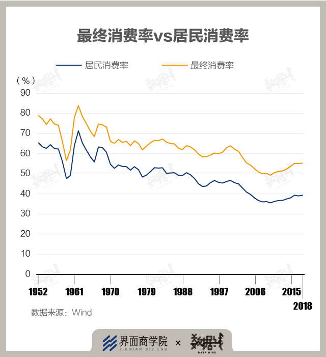 消费不足是中国经济过去20多年面临的一个痼疾。始于上世纪末期的“扩大内需”政策,由于更侧重“内需”中的投资需求而不是消费需求,导致中国最终消费率和居民消费率出现了连续近十年的下滑,直到2011年开始才逐渐上行。2019年最终消费率为55.3%,由于最终消费中还包含了政府消费(占比27.5%左右),居民消费率仅为39.4%。