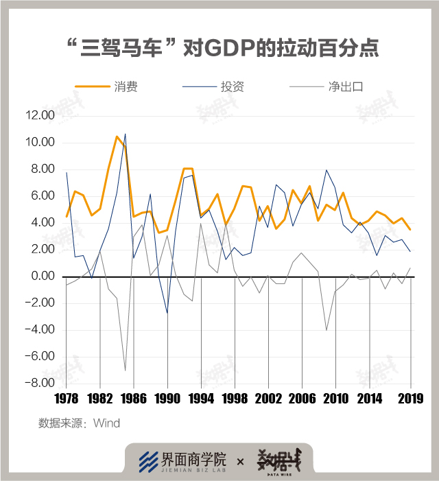其次,中国GDP增速已经从2010年的10.6%下降至2019年的6.1%,在投资和净出口回落导致的经济下滑期间,消费率和消费贡献率的上升是“相对的”和“被动的”。从消费对GDP增速拉动的百分点来看,2010年以来处于下行通道,2019为3.53个百分点,而1978年以来的均值为5.41个百分点,目前已位于历史最低水平区间。当然,相比“大起大落”的投资和净出口,消费相对稳健,正是在这个意义上,消费构成了中国经济韧性的基础。